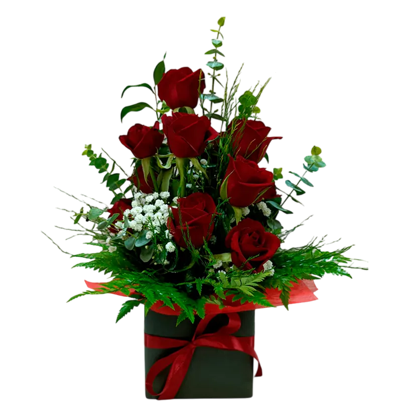 Caja de rosas rojas en base decorativa de material reciclado, ideal para aniversarios, cumpleaños o detalles románticos. Preparada de forma artesanal con flores frescas seleccionadas.