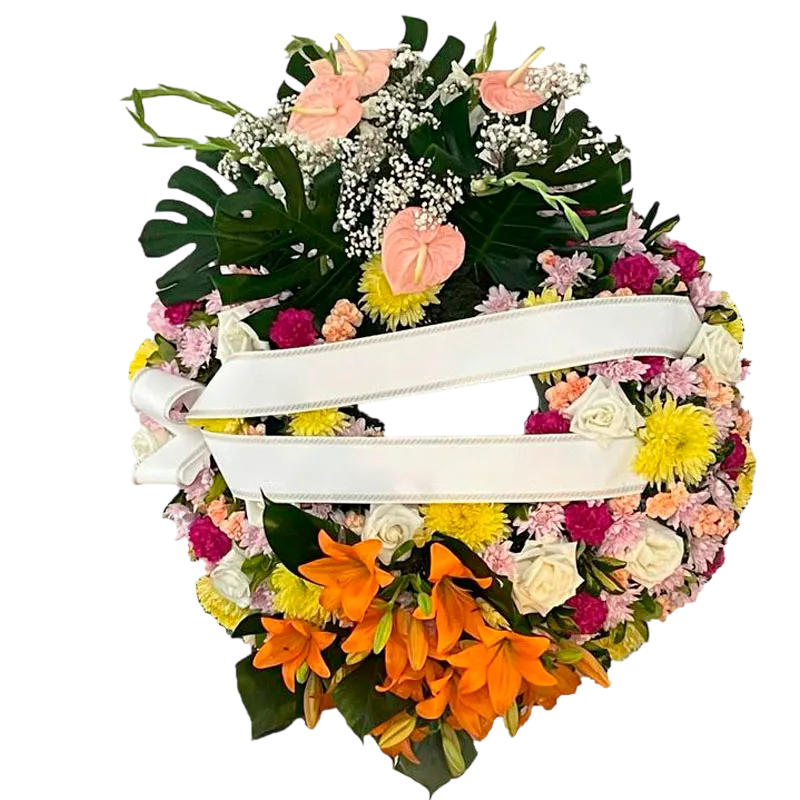 Un tributo de altura. Esta corona destaca por su imponente cabezal superior, una agrupación floral que preside el arreglo otorgándole jerarquía y sofisticación. Combina la delicadeza de la flor principal con una base de verdes exuberantes. Presencia garantizada.