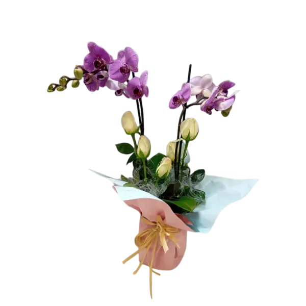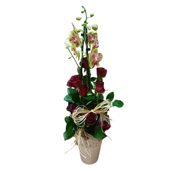 Exclusivo arreglo de orquídea Phalaenopsis con rosas incrustada, un detalle de lujo supremo que combina elegancia, sofisticación y belleza inigualable.
