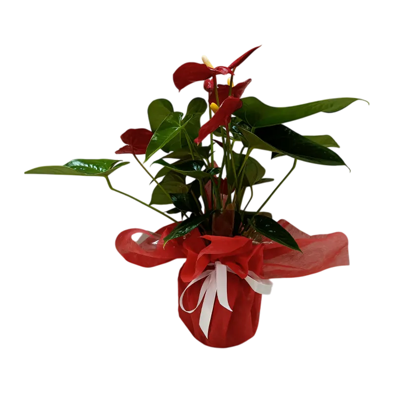 Anthurium rojo, planta de interior elegante y llamativa, ideal para aportar color y sofisticación a hogares, oficinas o espacios decorativos.